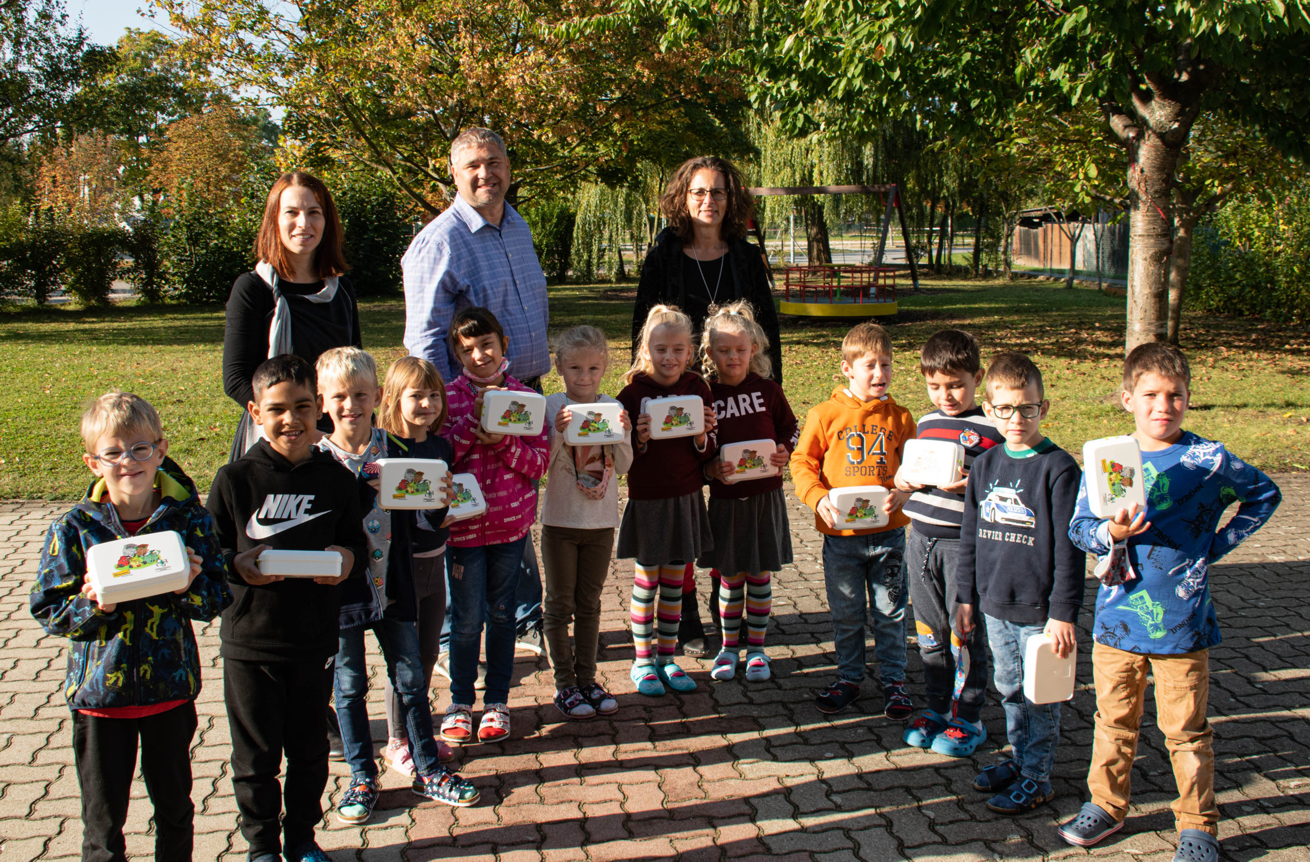 jedem Kind der 1. Klasse eine Jausenbox mit.